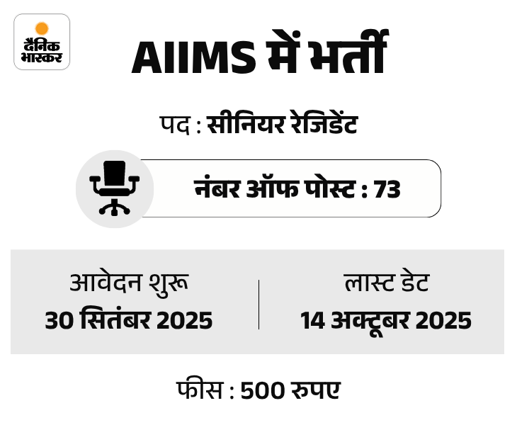 ऑल इंडिया इंस्टीट्यूट ऑफ मेडिकल साइंसेज की ओर से सीनियर रेजिडेंट के 73 पदों पर भर्ती निकली है। उम्मीदवार ऑफिशियल वेबसाइट aiimsnagpur.edu.in पर जाकर आवेदन कर सकते हैं।