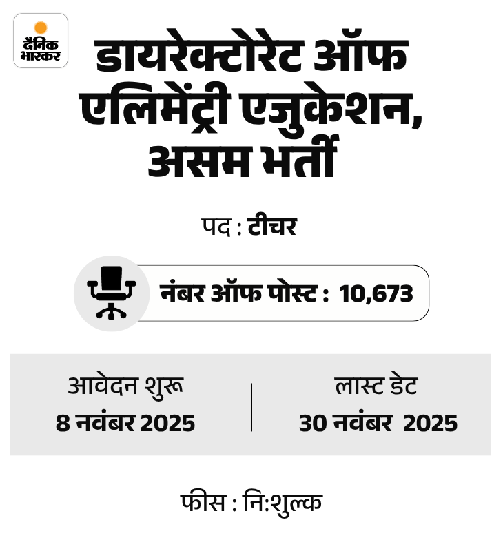 प्रारंभिक शिक्षा निदेशालय (DEE) असम ने लोअर प्राइमरी स्कूल और अपर प्राइमरी स्कूलों में 10,673 पदों पर भर्ती निकाली है। फिलहाल इस भर्ती का शॉर्ट नोटिफिकेशन जारी किया गया है। इस भर्ती के लिए आवेदन प्रक्रिया की शुरुआत 8 नवंबर से होगी। उम्मीदवार ऑफिशियल वेबसाइट dee.assam.gov.in पर जाकर आवेदन कर सकेंगे।