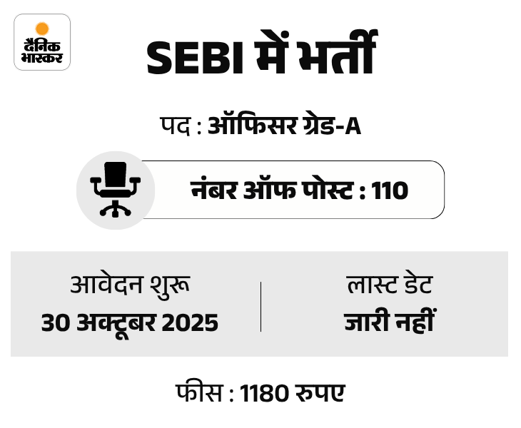 भारतीय प्रतिभूति और विनिमय बोर्ड (SEBI) ने ग्रेड ए ऑफिसर के पदों पर वैकेंसी निकाली है। इस भर्ती के लिए आवेदन प्रक्रिया आज यानी 30 अक्टूबर से शुरू हो रही है। उम्मीदवार ऑफिशियल वेबसाइट sebi.gov.in के माध्यम से अप्लाई कर सकते हैं।