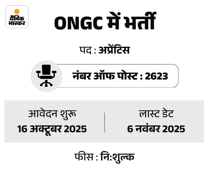 ऑयल एंड नेचुरल गैस कॉर्पोरेशन लिमिटेड ने अप्रेंटिस के ढाई हजार से ज्यादा पदों पर भर्तियां निकाली हैं। इस भर्ती के लिए आवेदन का आज आखिरी दिन है। उम्मीदवार ओएनजीसी (ONGC) की ऑफिशियल वेबसाइट ongcindia.com पर जाकर अप्लाई कर सकते हैं।