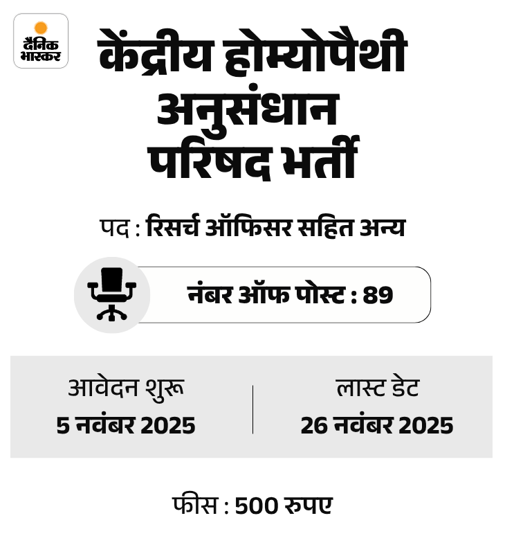 केंद्रीय होम्योपैथी अनुसंधान परिषद (CCRH) ने ग्रुप A, B और C के पदों पर भर्ती निकाली है। उम्मीदवार ऑफिशियल वेबसाइट ccrhindia.ayush.gov.in, ccrhonline.in या eapplynow.com के माध्यम से ऑनलाइन आवेदन कर सकते हैं।