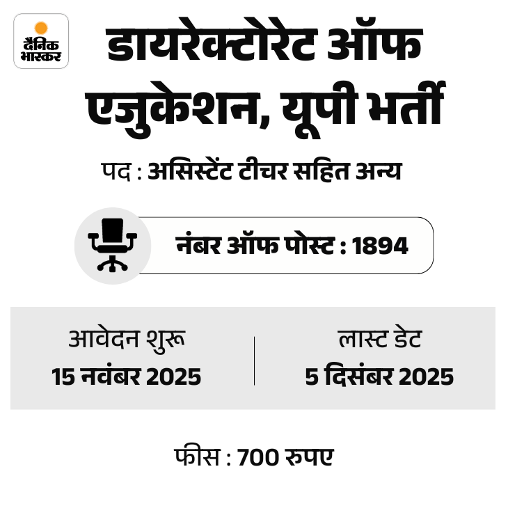 सरकारी नौकरी:यूपी में टीचर के 1894 पदों पर भर्ती का नोटिफिकेशन जारी; 15 नवंबर से आवेदन शुरू, बिना इंटरव्यू के सिलेक्शन