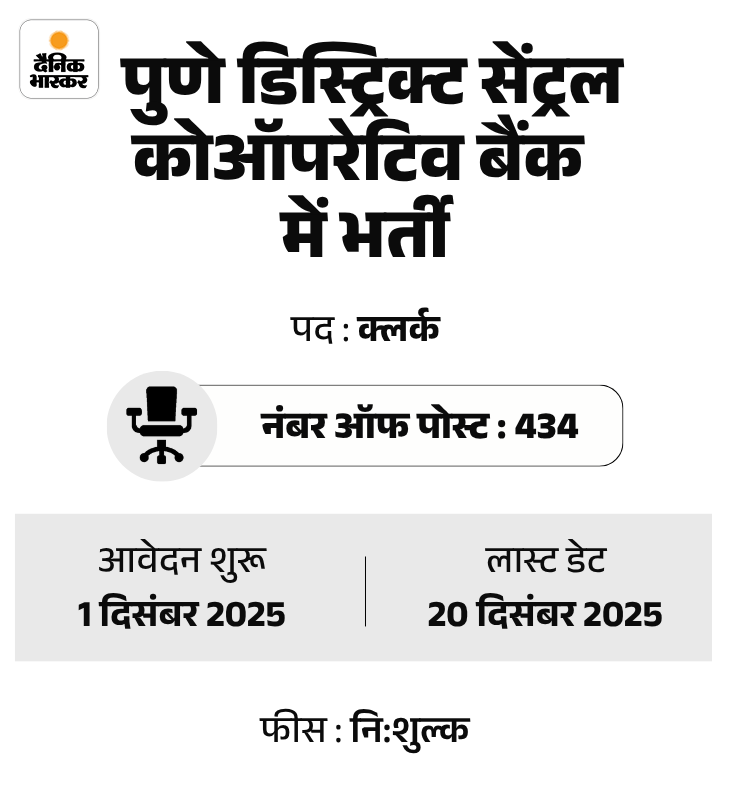 पुणे डिस्ट्रिक्ट सेंट्रल कोऑपरेटिव बैंक में 434 पदों पर भर्ती का नोटिफिकेशन जारी किया गया है। उम्मीदवार ऑफिशियल वेबसाइट pdcc.bank.in पर जाकर आवेदन कर सकते हैं।