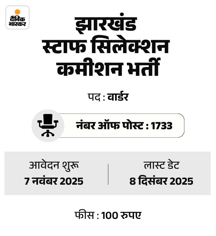 झारखंड कर्मचारी चयन आयोग (JSSC) ने वार्डर भर्ती 2025 के लिए आवेदन प्रक्रिया की शुरुआत आज से कर दी है। उम्मीदवार ऑफिशियल वेबसाइट jssc.jharkhand.gov.in पर जाकर अप्लाई कर सकते हैं।