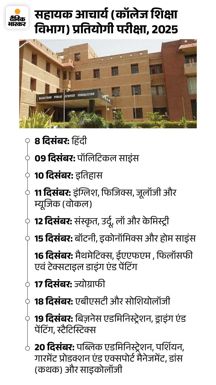 राजस्थान लोक सेवा आयोग द्वारा गुरुवार को सहायक आचार्य (कॉलेज शिक्षा विभाग) प्रतियोगी परीक्षा, 2025 का टाइम टेबल घोषित कर दिया गया है। कार्यक्रमानुसार 30 विषयों की परीक्षा का आयोजन 7 से 20 दिसंबर 2025 तक किया जाएगा। ये परीक्षा पूर्व में 1 दिसम्बर से होने वाली थी, लेकिन इसमें आयोग ने अब बदलाव कर दिया है।
