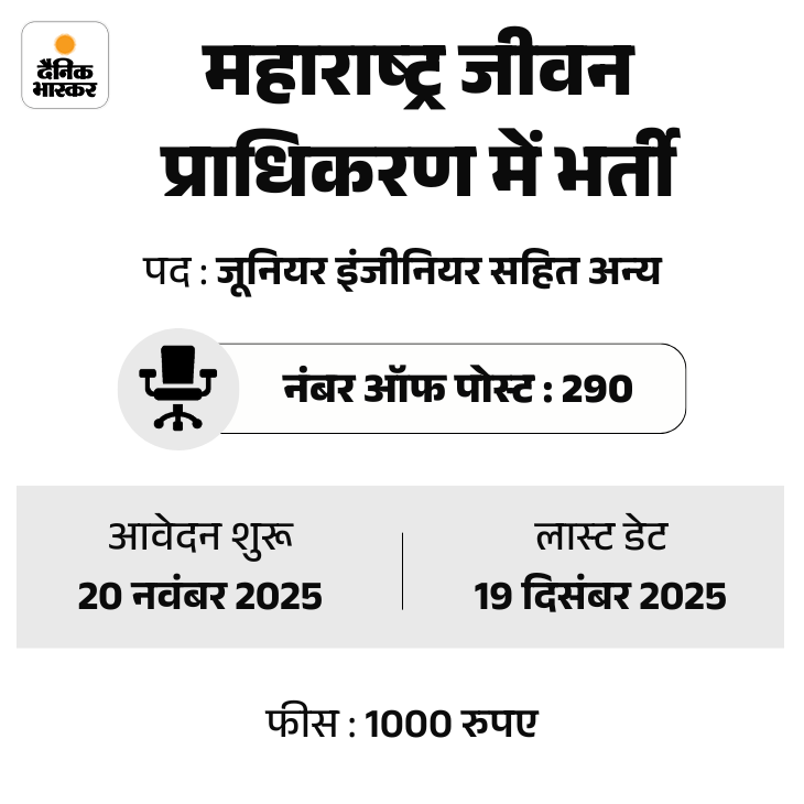 महाराष्ट्र जीवन प्राधिकरण (Maharashtra Jeevan Pradhikaran) ने 290 पदों पर भर्ती का नोटिफिकेशन जारी किया है। उम्मीदवार ऑफिशियल वेबसाइट mjp.maharashtra.gov.in पर जाकर आवेदन कर सकते हैं।