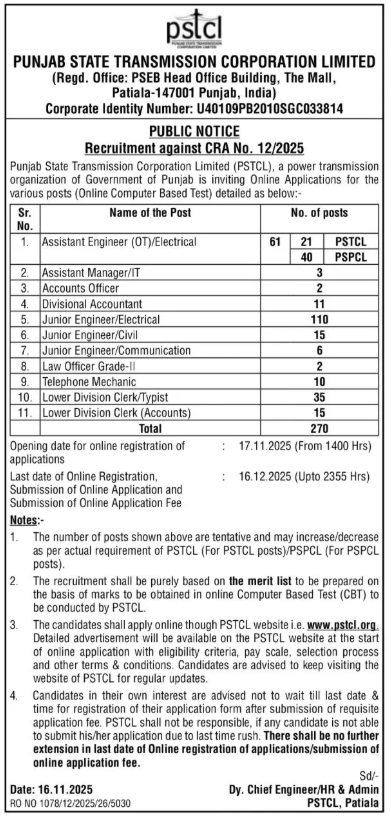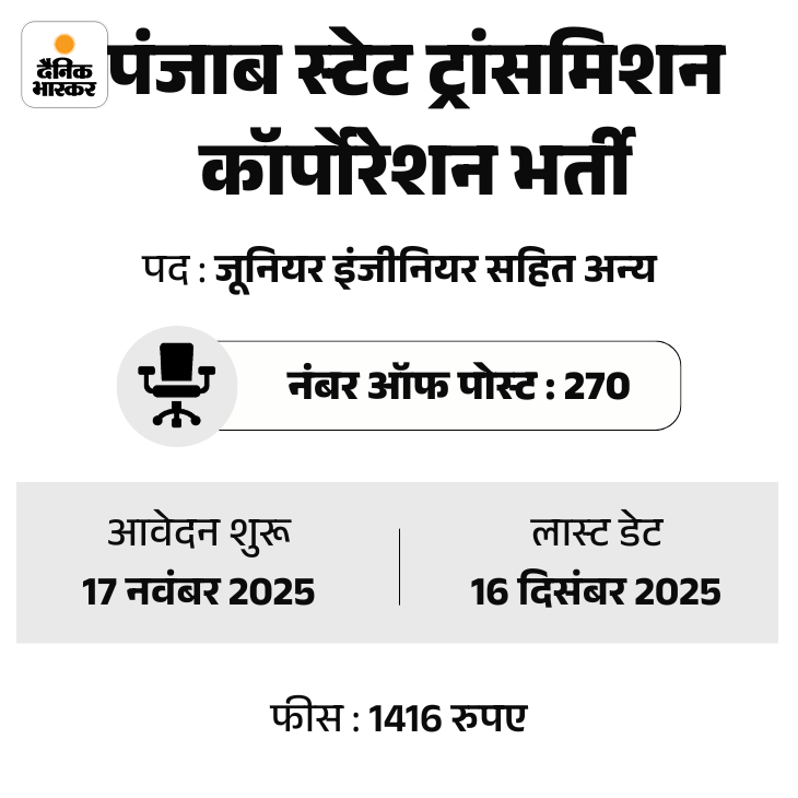 पंजाब स्टेट ट्रांसमिशन कॉर्पोरेशन में 270 पदों पर भर्ती निकली है। उम्मीदवार वेबसाइट pstcl.org पर जाकर आवेदन कर सकते हैं।