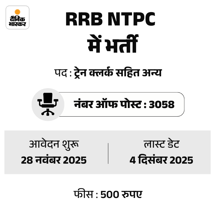 रेलवे भर्ती बोर्ड (RRB) ने एनटीपीसी में 3058 पदों पर भर्ती निकाली है। इस भर्ती के लिए आवेदन की आखिरी तारीख 29 नवंबर थी जिसे आगे बढ़ाकर 4 दिसंबर कर दिया गया है। उम्मीदवार ऑफिशियल वेबसाइट rrbapply.gov.in पर जाकर आवेदन कर सकते हैं। फॉर्म में करेक्शन 07 दिसंबर से 16 दिसंबर, 2025 के बीच किए जा सकेंगे।