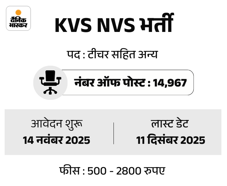 केंद्रीय विद्यालयों एवं नवोदय विद्यालयों में टीचिंग एवं नॉन टीचिंग के कुल 14,967 पदों पर भर्ती के लिए आवेदन करने की आखिरी तारीख को बढ़ा दिया गया है। अब उम्मीदवार 11 दिसंबर, 2025 तक अप्लाई कर सकते हैं।