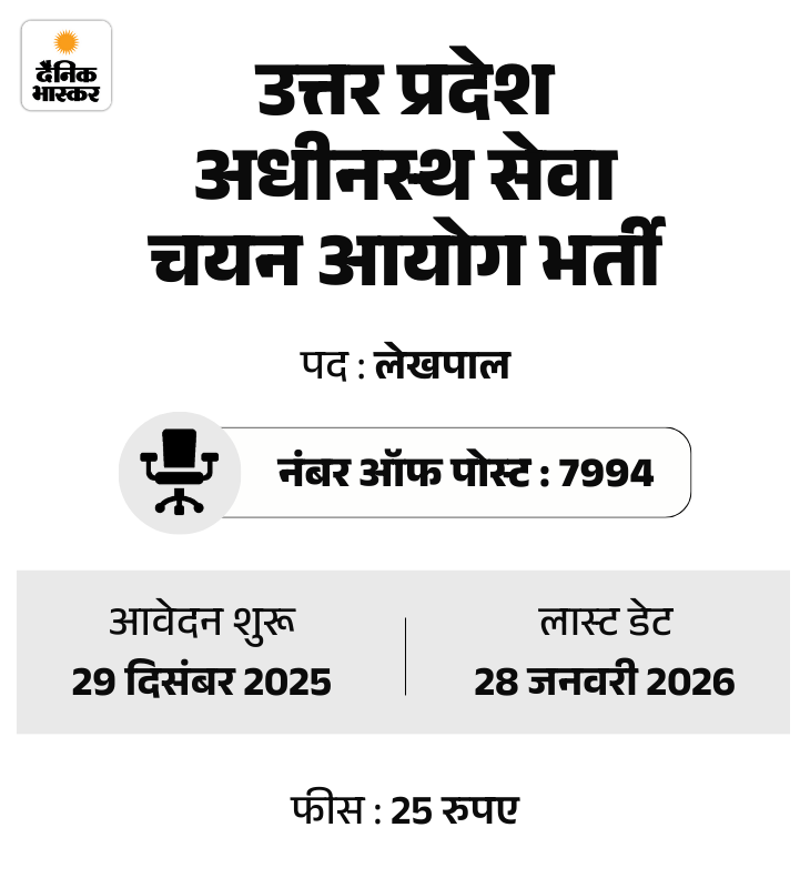 उत्तर प्रदेश अधीनस्थ सेवा चयन बोर्ड (UPSSSC) ने लेखपाल के 7000 से ज्यादा पदों पर भर्ती निकाली है। उम्मीदवार भर्ती बोर्ड की ऑफिशियल वेबसाइट upsssc.gov.in पर जाकर अप्लाई कर सकते हैं। इस भर्ती के लिए फीस जमा करने की आखिरी तारीख भी 28 जनवरी 2026 तय की गई है।
