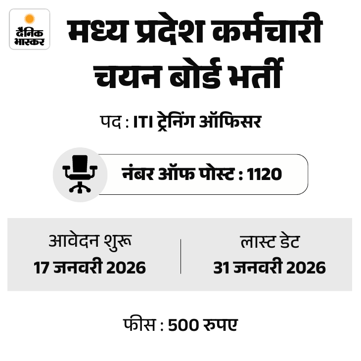 मध्यप्रदेश कर्मचारी चयन बोर्ड (MPESB) ने ITI ट्रेनिंग ऑफिसर भर्ती 2026 के लिए नोटिफिकेशन जारी किया है। इस भर्ती के लिए आवेदन प्रक्रिया कल यानी 17 जनवरी से शुरू हो रही है। उम्मीदवार ऑफिशियल वेबसाइट esb.mp.gov.in पर जाकर आवेदन कर सकेंगे।