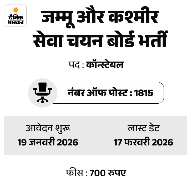 जम्मू और कश्मीर सेवा चयन बोर्ड (JKSSB) ने कॉन्स्टेबल के पदों पर भर्ती निकाली है। इस भर्ती के लिए आवेदन प्रक्रिया 19 जनवरी, 2026 से शुरू हो रही है। उम्मीदवार ऑफिशियल वेबसाइट jkssb.nic.in पर जाकर आवेदन कर सकेंगे।