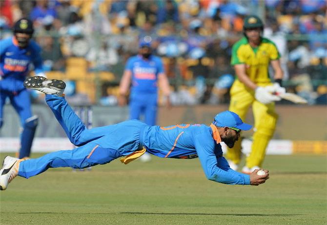 | एरॉन फिंच रनआउट (जडेजा/श्रेयस/शमी) |