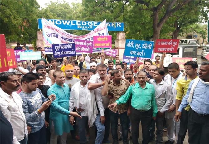 शहर में लगातार हो रही चोरी लूटमार की अपराधिक घटनाओं के विरोध में आमजन व्यापार मंडल प्रबुद्ध जन संघर्ष समिति बूंदी के तत्वाधान में शुक्रवार को विरोध स्वरूप 2 घंटे का सांकेतिक बंद रखा गया । जिसका सभी प्रकार के व्यापार मंडल ,सामाजिक संगठन, शिक्षण संस्थान , अभिभाषक परिषद, आढ़तिया संघ, मुख्य बाजार , पेट्रोल पंप एसोसिएशन समर्थन करते हुए विरोध स्वरूप सुबह 10:00 बजे से 12:00 बजे तक अपने अपने कार्यालय, प्रतिष्ठान, संस्थाएं , बंद रखें व सभी प्रकार के कार्य स्थगित रहें। संघर्ष समिति के रूपेश शर्मा ने बताया कि शहर में कुछ दिनों से व्यापारिक प्रतिष्ठानों पर लूटमार व चोरी की अपराधिक घटनाएं बढ़ती जा रही है। जिस पर पुलिस प्रशासन का कोई ध्यान नहीं है। शहर में घटी लूटपाट व चोरी की एक दर्जन घटनाओं का खुलासा करने में पुलिस प्रशासन असफल रहा है। इन घटनाओं से आमजन व व्यापारियों में पुलिस प्रशासन के खिलाफ खासा रोष व्याप्त है। इसी को लेकर संघर्ष समिति ने आज विरोध स्वरूप 2 घंटे बूंदी बंद का आह्वान रखा था। जिसको अभिभाषक परिषद , सभी शिक्षण संस्थाओं , सभी व्यापारिक संगठनों , औद्योगिक प्रतिष्ठानों, सामाजिक संगठनों सहित 3 दर्जन संघठनो सहित आमजन ने समर्थन दिया। बंद के बाद सभी व्यापारी व संघर्ष समिति के लोग बारिश के बावजूद जैन मंदिर चौगान गेट पर इकट्ठा होकर वहां से जुलूस के रूप में कोटा रोड एक नंबर की छतरी रघुवीर भवन अहिंसा सर्किल होते हुए जिला कलेक्ट्रेट पहुंचें जहां मुख्यमंत्री के नाम जिला कलक्टर को ज्ञापन सौपा। ज्ञापन में मांग की कि अभयकमान के 460 कैमरे तुरंत प्रभाव से लगाए जाए। कैमरे अच्छे क्वालिटी के लगाया जाए । वर्तमान समय में लगे हुए कैमरे अच्छी क्वालिटी के नहीं होने के कारण इनका सदुपयोग नहीं हो पा रहा है। ज्ञापन देने वालों में व्यापारिक संगठन ,संघर्ष समिति ,व्यापारी, सभी पीड़ित व्यक्ति शामिल रहे। शर्मा ने कहा कि हमारे द्वारा शांतिपूर्ण तरीके से 2 घंटे का सांकेतिक बंद रखा गया। ज्ञापन देने वालो में समिति के परमेश्वर झवर, कालू कटारा, सत्यनारायण सोनी, सोहन तोषनीवाल, पितांबर शर्मा ,बंटी लड्डा , हरीश बिलोची, गोपी गिलानी, रोशन बिलोची, मुकेश माधवानी ,संजय नंदवाना, रोहित झालानी मौजूद रहे।