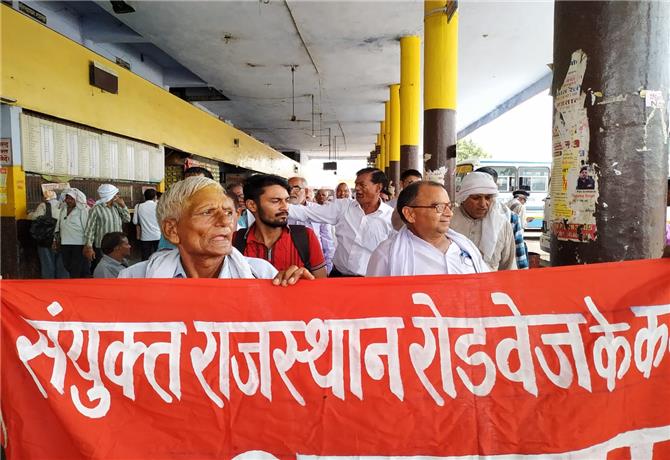 राजस्थान रोडवेज के श्रमिक संगठनों द्वारा प्रदेश व्यापी आह्वान पर सरकार की वादाखिलाफी के विरोध मे केन्द्रीय बस स्टैण्ड परिसर में घरना प्रदर्शन किया गया। राजस्थान रोडवेज श्रमिक यूनियन के प्रदेश सचिव राजेन्द्र सिंह सोलकी ने बताया कि राजस्थान रोड़वेज के श्रामिक संगठनो द्वारा सरकार की वादा खिलाफी के विरोध मेंं आज केन्द्रीय बस स्टैण्ड पर प्रदेश व्यापी धरना प्रदर्शन किया गया। घरना प्रदर्शन में एटक, सीटू, इन्टक, रिटायर्ड एसोसियेशन,बीजेएमएम, एंव कल्याण समिति के पदाधिकारियों ने इस प्रदेशव्यापी धरना प्रदर्शन में हिस्सा लिया। राजेन्द्र सिंह सोलकीं ने सरकार की वादा खिलाफी के विरोध में आज एक घण्टे तक सरकार के खिलाफ नारेबाजी करते हुय कांग्रेस प्रदेश अध्यक्ष सचिन पायलट तथा परिवहन मंत्री प्रताप सिंह खाचारियावास के प्रति अपनी नाराजगी जाहिर की। उन्होंने राज्य सरकार पर आरोप लगाते हुये कहा कि राजस्थान सरकार ने सितम्बर माह में हुई हड़ताल को देखते हुये आश्वासन दिया था कि रोजवेज कर्मचारियों की नई भर्ती, नई बस, सातवें वेतन आयोग तथा रिटायर्ड रोडवेज कर्मचारियों के बकाया भुगतान जैसी समस्याओं पर सकारात्मक कार्यवाही अमल में लाई जायेगी। लेकिन आज 10 माह बाद भी रोड़वेजकर्मियों की मांगो पर कोई कार्यवाही नही हुई है साथ ही बजट में रोडवेज के हित को देखते हुये कोई भी घोषणा नही की गई। जिससे रोडवेज कर्मियों में सरकार के प्रति काफी रोष व्याप्त है।