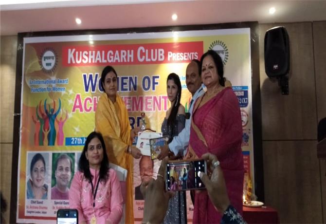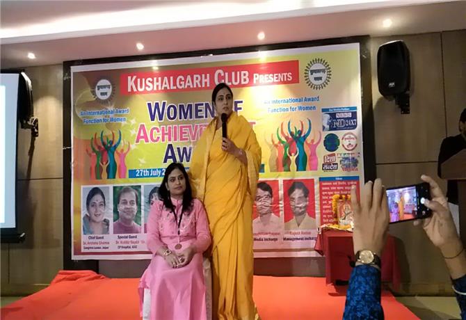 कुशलगढ़ क्लब द्वारा नेशनल वूमेन अवार्ड कार्यक्रम का आयोजन जयपुर वैशाली नगर स्थित अवाना होटल में आयोजित किया गया। जिसमें मुख्य अतिथि डॉ अर्चना शर्मा (उपाध्यक्ष एवं मीडिया चेयर पर्सन प्रदेश कांग्रेस कमेटी राजस्थान) अध्यक्षता क्लब चेयरमैन लक्ष्मीकांत शर्मा, विशिष्ट अतिथि डॉ. छितिज गुप्ता, डॉ ज्योति भारती गोस्वामी, कामेडियन पूनम ठकराल ने की। सर्वप्रथम अतिथियों द्वारा दीप प्रज्वलित कर कार्यक्रम का शुभारंभ किया गया और क्लब के सदस्यों द्वारा अतिथियों का स्वागत किया गया। इस अवसर पर अंतरराष्ट्रीय शांति वक्ता प्रेम रावत का शांति संदेश प्रोजेक्टर के माध्यम से सुनाया गया। कार्यक्रम में गंगापुरसिटी की बालिका प्रियांशी शर्मा एवं एंजल खंडेलवाल द्वारा सांस्कृतिक कार्यक्रम प्रस्तुत किया गया। कार्यक्रम में मुख्य अतिथि डॉ अर्चना शर्मा द्वारा अंतरराष्ट्रीय वूमेन अवार्ड से उदयपुर की डॉ.रंजना जोशी को सम्मानित किया गया। जिसने अपने जीवन चार वर्ष की उम्र से पांच बड़े ऑपरेशन हुए। जिसके चलते भारी अपंगता बनी। बावजूद उन्होंने सफलता का मुकाम हासिल किया। कोटा से आई रेखा शर्मा जो कि अपने क्षेत्र में सामाजिक कार्यों के लिए हमेशा तैयार रहती है और केदारनाथ महिला एरिया के अध्यक्ष है। इन्हें अंतरराष्ट्रीय वूमेन अवार्ड से सम्मानित किया गया। इस कार्यक्रम में भाटी मंजूलता मोरिया, मौसम मीणा, आयशा गोस्वामी, दीप्ति खंडेलवाल, रुकमणी देवी, अनुजा ठाकुर, लीना तनुजा, सपना गोयल, मीनाक्षी नामदेव, नीतिशा शर्मा, पूनम भास्कर, सोनिया अहूजा, एंजल सहित कई महिलाओं को नेशनल अवार्ड से सम्मानित किया गया। इस अवसर पर मुख्य अतिथि अर्चना शर्मा ने कहा कि आज विश्व में महिलाओं का बहुत अधिक महत्व है।