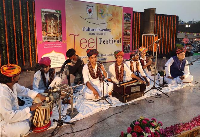 तीज उत्सव पर राजस्थान पर्यटन एवं दिल्ली पर्यटन विभाग द्वारा दिल्ली हाट आई.एन.ए. एवं जनकपुरी में आयोजित सांस्कृतिक संध्याओ में राजस्थानी कलाकारों की शानदार प्रस्तुतिया ने दर्शको का मन मोह लिया।राजस्थान पर्यटन विभाग की अतिरिक्त निदेशक गुणजीत कौर ने बताया कि सावन के मौसम में आयोजि हुई इन सांस्कृतिक संध्या में प्रदेश के विभिन्न भागों से आये राजस्थानी कलाकारों ने उत्साहवद्र्धक कार्यक्रम प्रस्तुत किये। सांस्कृतिक कार्यक्रमो में जनकपुरी दिल्ली हाट में जोधपुर के रफीक लंगा ने खड़ताल वादन और सुरमनाथ कालबेलिया एवं साथियों ने कालबेलिया, जयपुर के पवन शर्मा ने राजस्थानी नृत्य, दौसा के अशोक शर्मा ने मिमिक्री, निवाई, टोंक के रामप्रसाद शर्मा ने नाग लपेटा तथा भरतपुर के गफरूदीन मेवाती ने भपंग वादन की प्रस्तुति से दर्शकों का दिल जीत लिया। कार्यक्रम का संचालन दौसा के अशोक शर्मा ने किया। इसी प्रकार आई.एन.ए. दिल्ली हाट में अनिशुद्दिन ने चरी एवं राजस्थानी नृत्य, बाड़मेर के रफीक लंगा एवं साथियों ने खड़ताल वादन, किरण कुमारी एवं साथी कलाकारो ने घूमर नृत्य, डीग (भरतपुर) के जितेंद्र पाराशर और साथियों द्वारा गणेश वंदना, फूलों की होली और मयूर नृत्य, कविता ने भवई नृत्य की प्रस्तुति दी।
