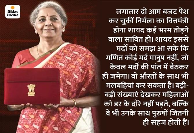 सिल्क की हल्की सुनहरी साड़ी में सतर कंधे और चुस्त जवाबों से लैस केंद्रीय वित्तमंत्री निर्मला सीतारमण का वीडियो वायरल हो रहा है। बजट के बाद प्रेस से बातचीत के दौरान एक वाकया घटा। हुआ ये कि पुरुष पत्रकारों के दनादन आते सवालों के बीच एक महिला पत्रकार ने भी सवाल किया, लेकिन इससे पहले कि उसकी बात पूरी हो पाती, वहां मौजूद एक अधिकारी ने रिपोर्टर को टोक दिया। इस पर निर्मला ने अधिकारी को ही घेरते हुए पूछा- आपने महिला पत्रकार को ही क्यों एक सवाल करने को कहा? इससे पहले पुरुषों को तो आपने नहीं रोका था।
