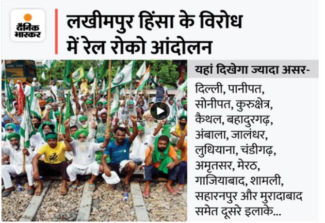 लखीमपुर हिंसा के मामले में संयुक्त किसान मोर्चा का आज (सुबह 10 से शाम 6 बजे तक) देश भर में रेल रोको आंदोलन चल रहा है। मोर्चे की मांग है कि लखीमपुर मामले में निष्पक्ष जांच तब तक नहीं हो सकती जब तक केंद्रीय गृह राज्यमंत्री अजय मिश्र को बर्खास्त नहीं किया जाता।